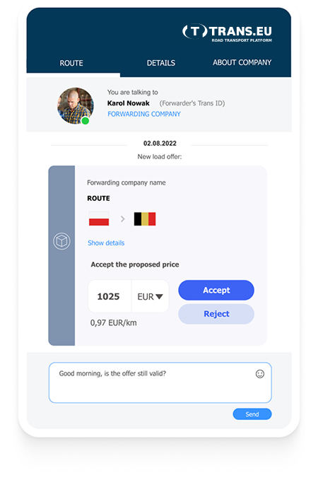 Trans.eu er en teknologileder og en av de mest populære fraktbørser i Europa. Transportplattformen vår garanterer umiddelbar tilgang til verifiserte og tilgjengelige transportselskaper dersom du ikke klarer å gi transportoppdrag til transportselskapene du har brukt tidligere.