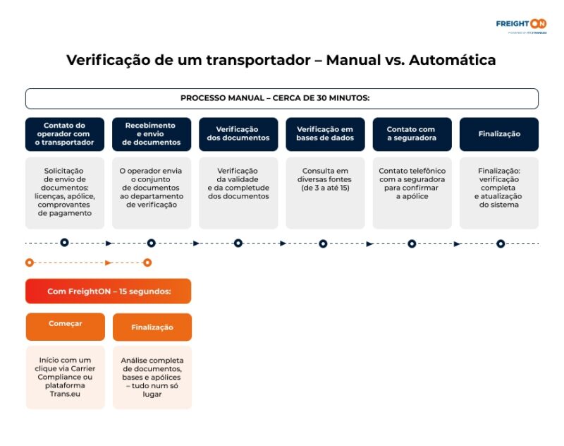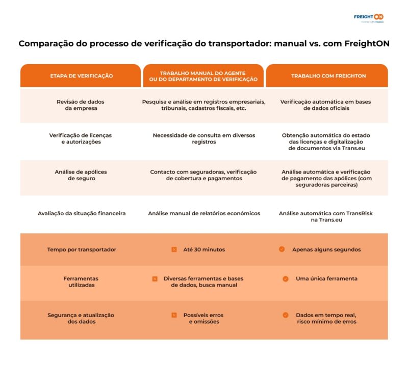 Uma verificação adequada da transportadora inclui a validação dos documentos de registro, licenças de transporte, situação financeira, seguros, avaliações do mercado e estado da frota de veículos. Esse processo exige o uso de várias ferramentas e bases de dados, o que resulta em custos e tempo. Verificar uma única empresa costuma levar cerca de 30 minutos. Dependendo da estrutura da empresa, a verificação é feita por uma única pessoa ou por uma equipa especializada que lida com dezenas de solicitações por dia.